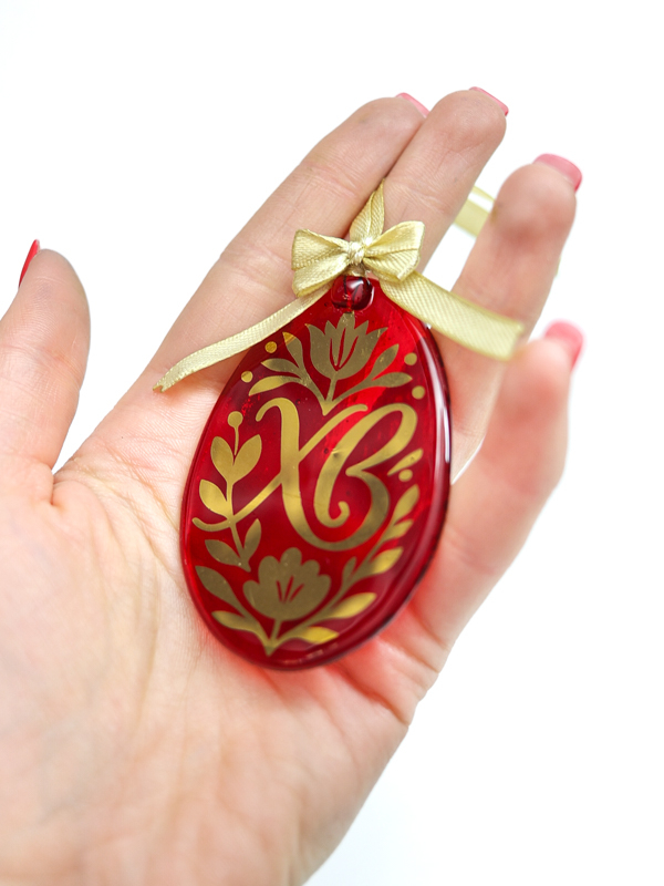 Стеклянное пасхальное яйцо с авторским орнаментом, выполненным настоящим золотом.