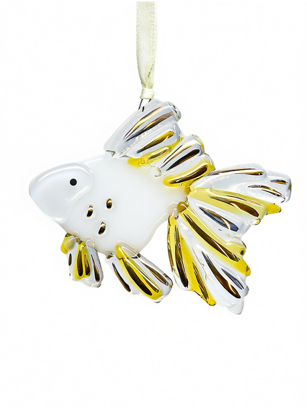Она словно вынырнула из новогодней сказки: с переливающимися плавниками, тельцем из нежного опалового стекла и роскошным золотым декором. Сделана вручную — в технике фьюзинг, где каждый кусочек стекла укладывается как мозаика, а потом спекается при 800°C. Да, это почти как волшебство — только с печью вместо волшебной палочки.