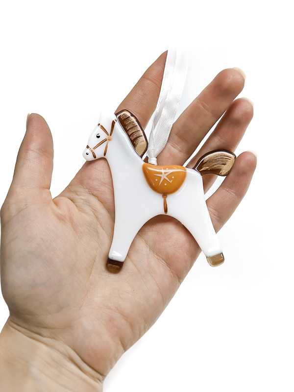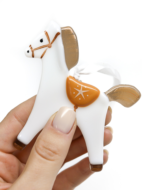 - Седло цвет карамели создаёт нежный контраст с белым стеклом и придаёт образу праздничную, почти кондитерскую теплоту, а прозрачная бронзовая грива расписана медным металликом, переливается в свете огоньков.