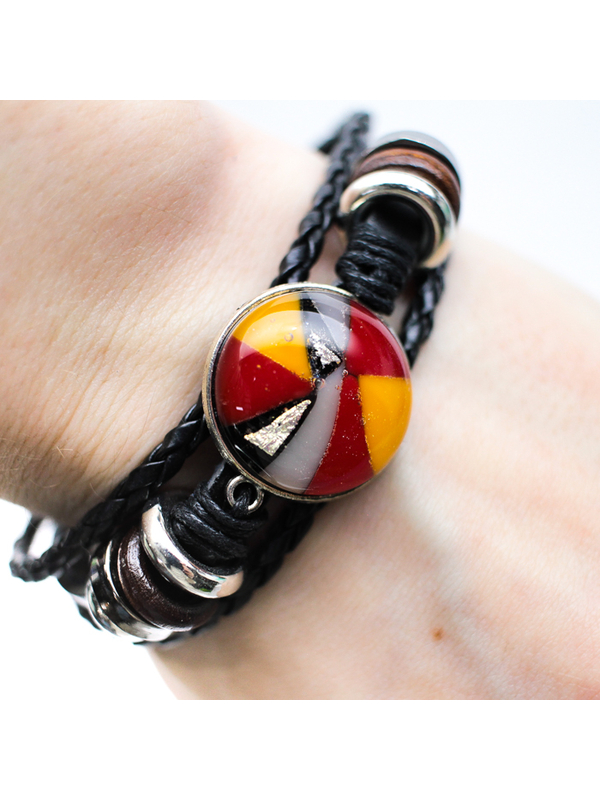главное украшение браслета - стеклянный кабошон, собранный из множества разноцветных кусочков стекла и запечённый в единую композицию при температуре 800 градусов