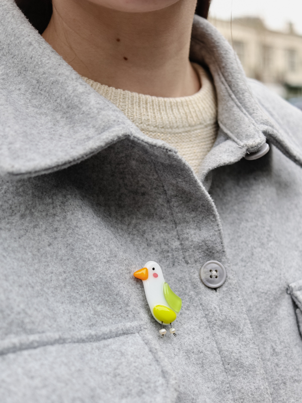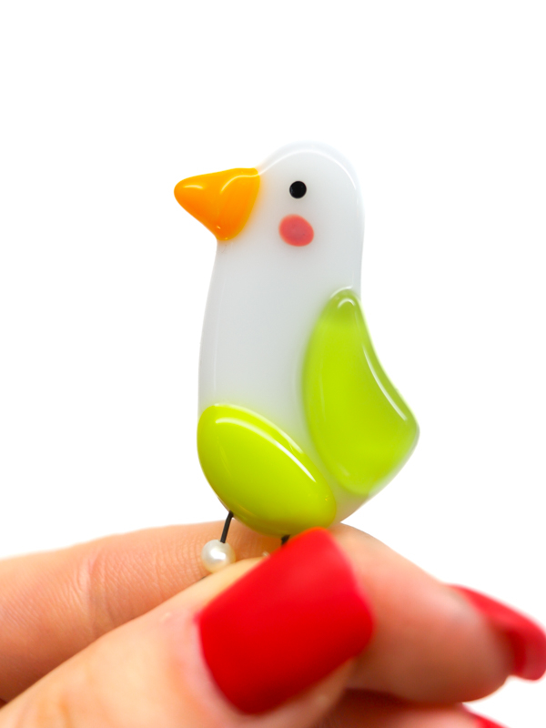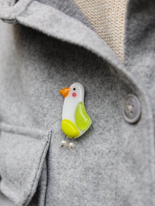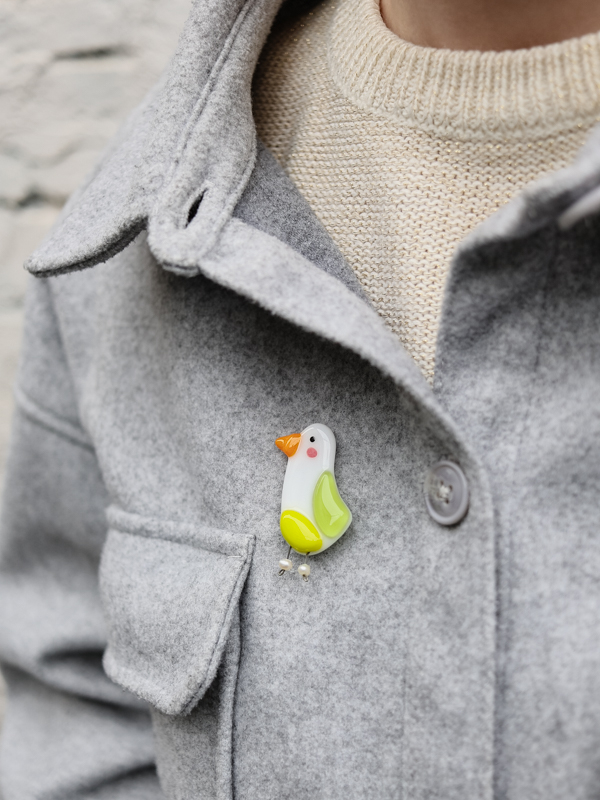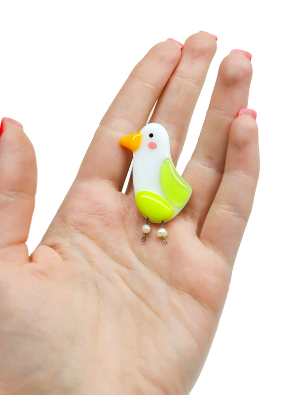 Стеклянная брошь в виде чайки с яркими цветными акцентами. Лёгкая, живая форма с игривым характером.