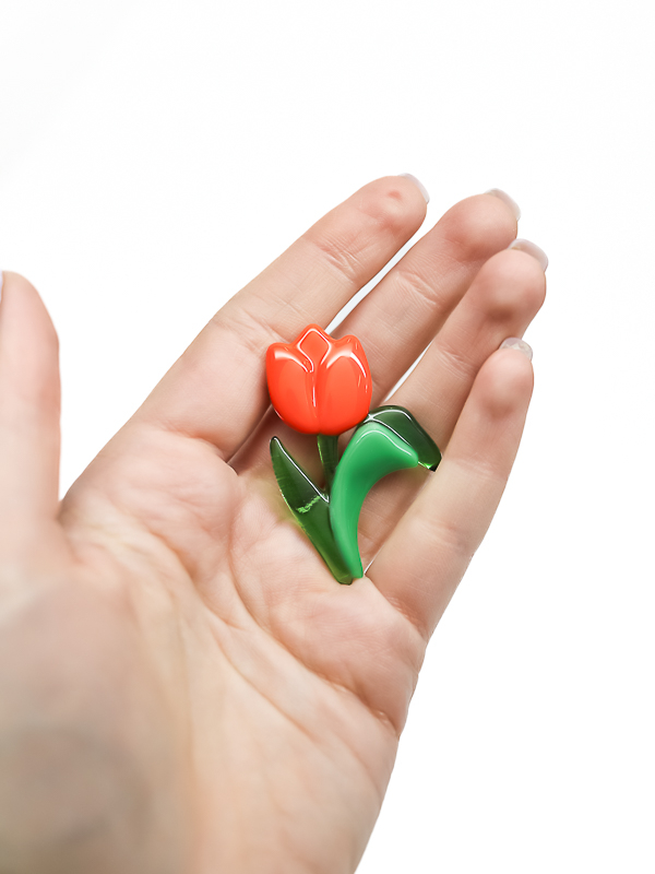 • Техника исполнения: украшение сделано полностью из стекла в технике фьюзинг или спекание ( подобно мозаике, изделие собирается из отдельных фрагментов, предварительно вырезанных и обточенных из соответствующего цвета листового художественного стекла, затем сплавляется в печи на температуре 800°C).