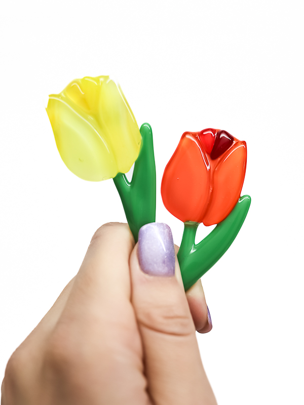• Техника исполнения: украшение сделано полностью из стекла в технике фьюзинг или спекание ( подобно мозаике, изделие собирается из отдельных фрагментов, предварительно вырезанных и обточенных из соответствующего цвета листового художественного стекла, затем сплавляется в печи на температуре 800°C).