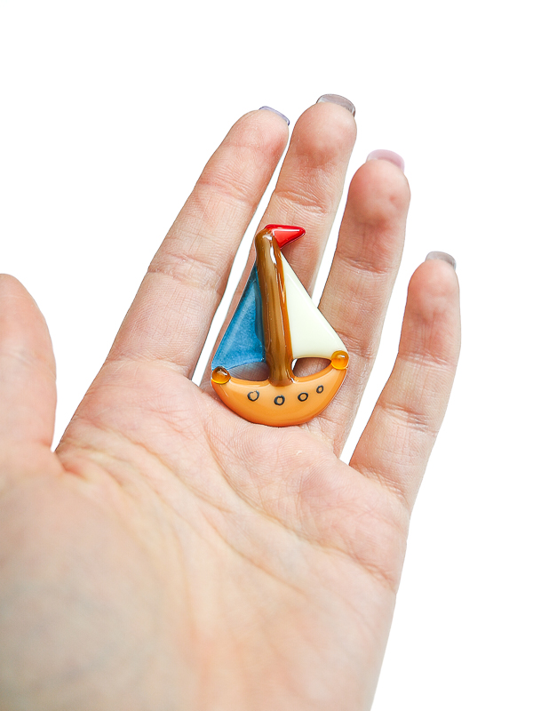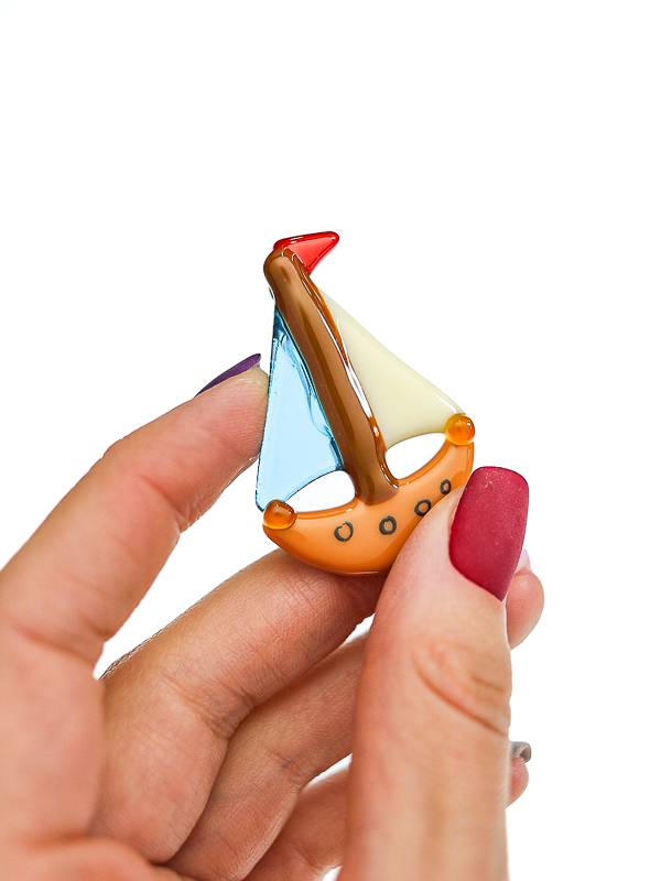 Техника исполнения: украшение сделано полностью из стекла в технике фьюзинг или спекание ( подобно мозаике, изделие собирается из отдельных фрагментов, предварительно вырезанных и обточенных из соответствующего цвета листового художественного стекла, затем сплавляется в печи на температуре 800°C).