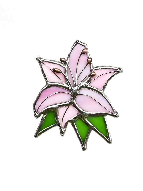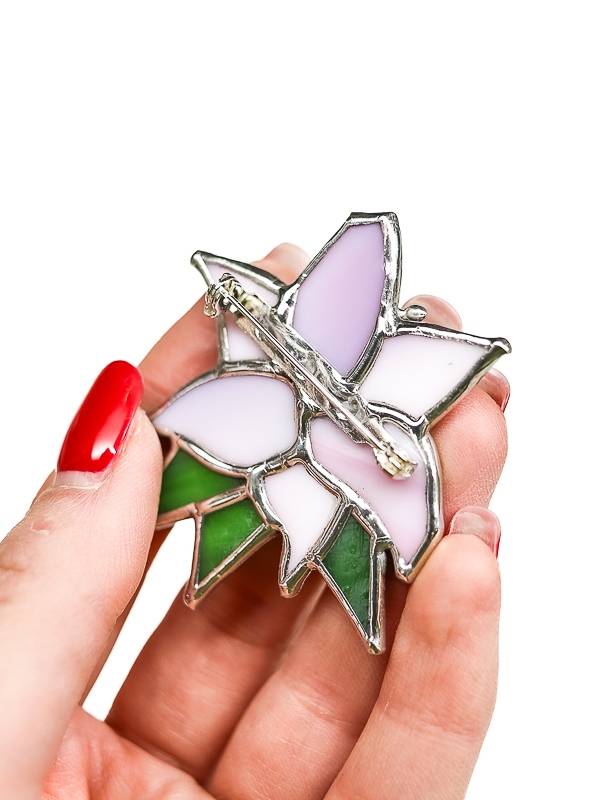 витражные брошки с оправой крепче брошек, сделанных целиком из стекла, в случае падения на пол брошь не разобьётся