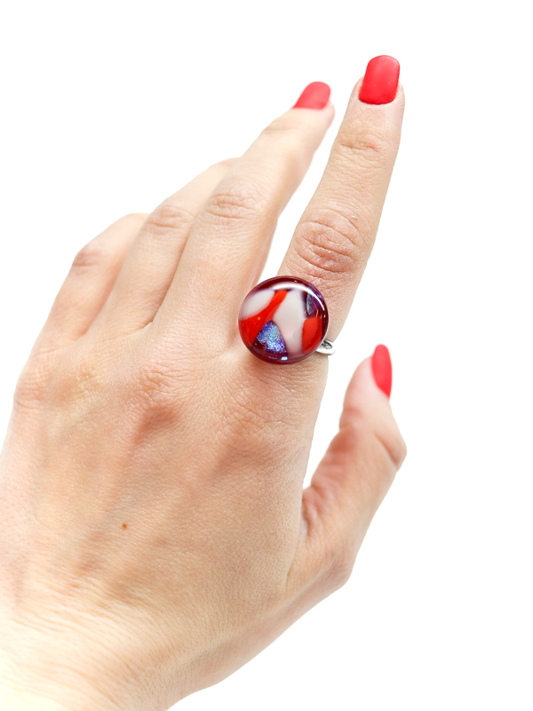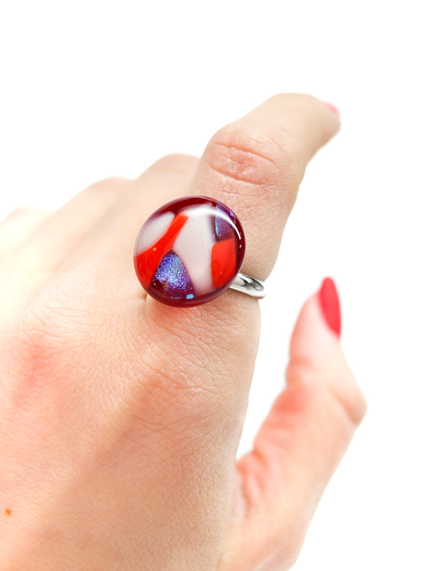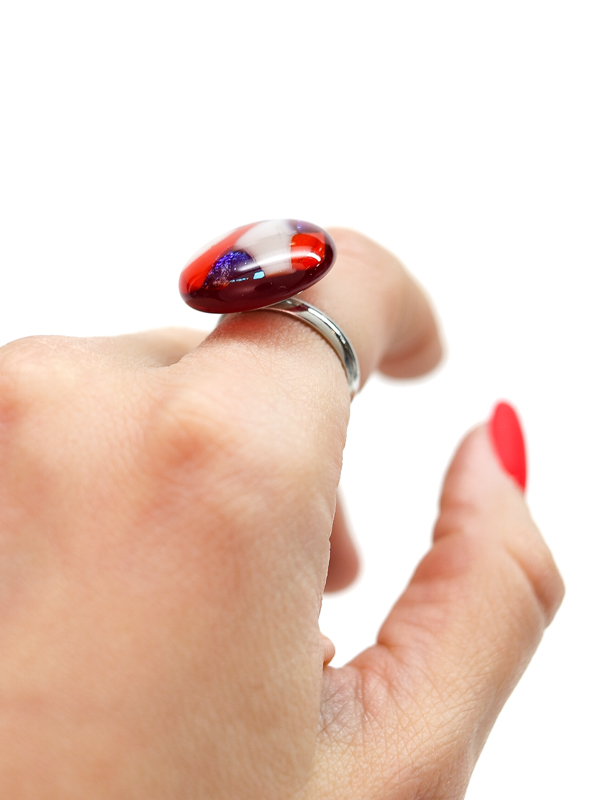 Кольцо со стеклянным кабошоном с контрастным сочетанием оттенков и дихроическим эффектом. Цветовые фрагменты складываются в выразительную композицию, создавая динамичную и необычную поверхность.