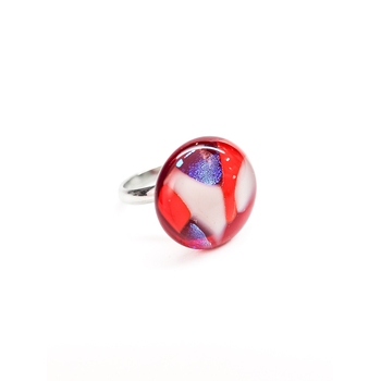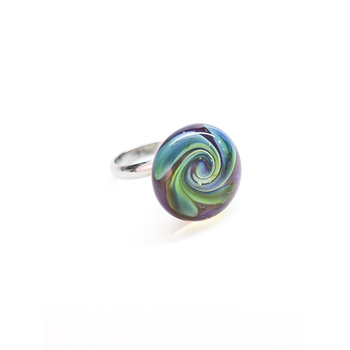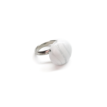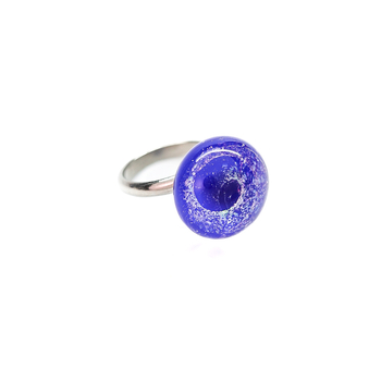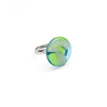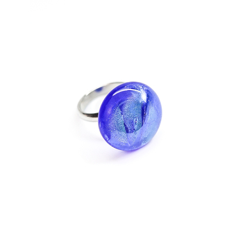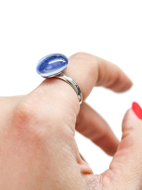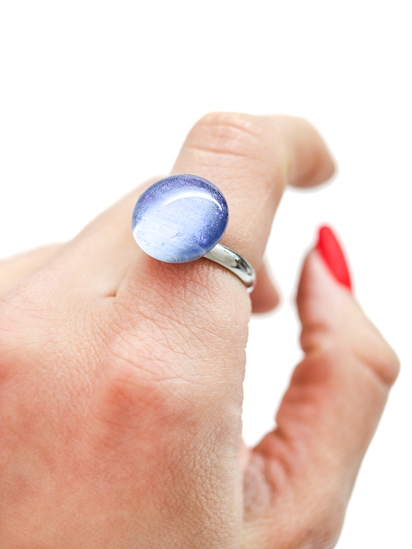 Кольцо с кабошоном нежного голубого оттенка. Дихроическое стекло создаёт мягкие переливы и лёгкую глубину цвета, благодаря чему украшение выглядит спокойным, но выразительным.