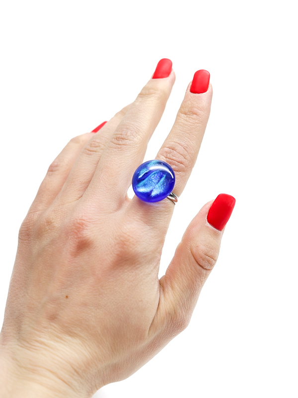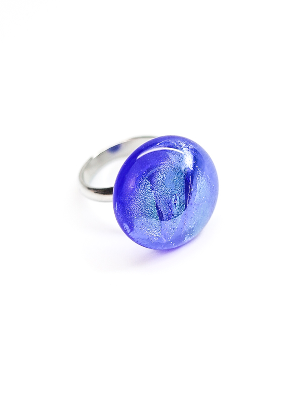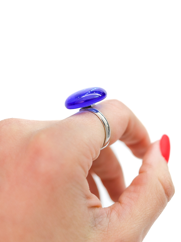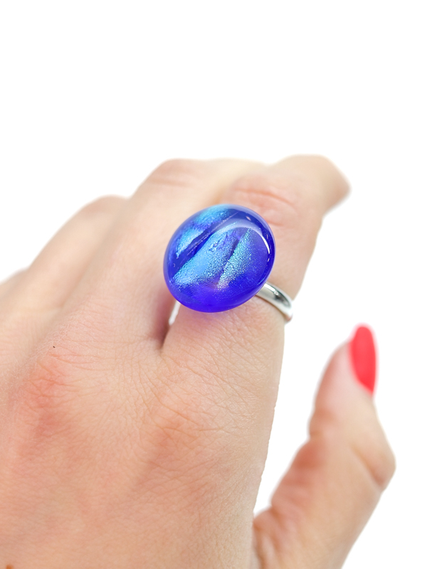 Кольцо со стеклянным кабошоном с дихроическим эффектом. Переливы насыщенных синих оттенков создают глубину и подчёркивают текстуру стекла.