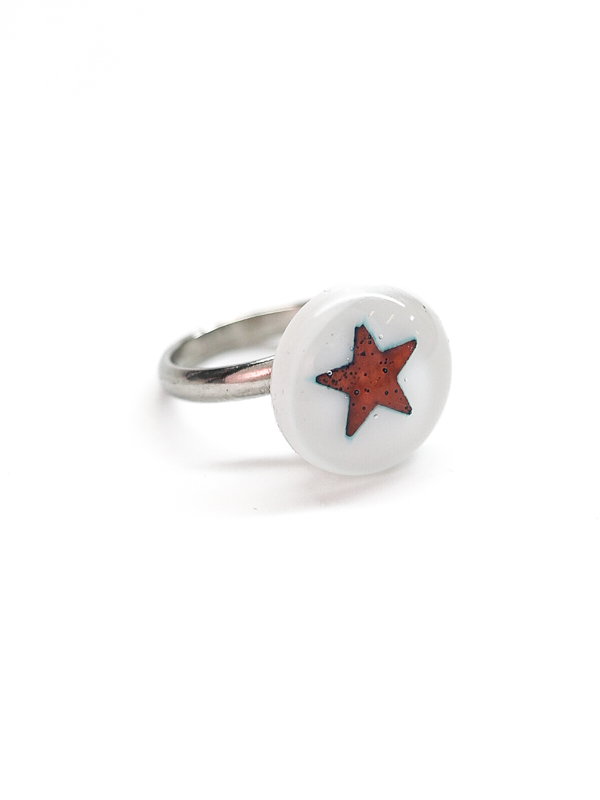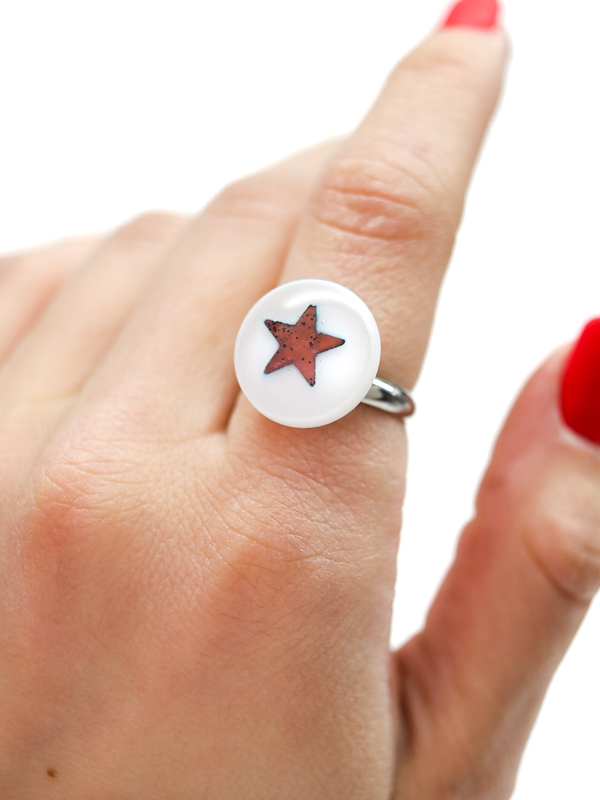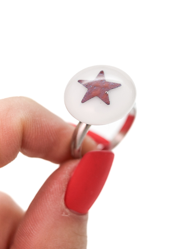 Кольцо со стеклянным кабошоном в лаконичной белой гамме с графичным символом. Контрастная звезда создаёт чистый и выразительный акцент.