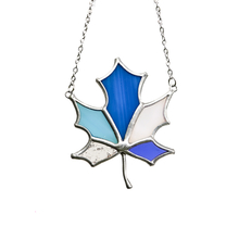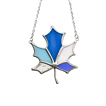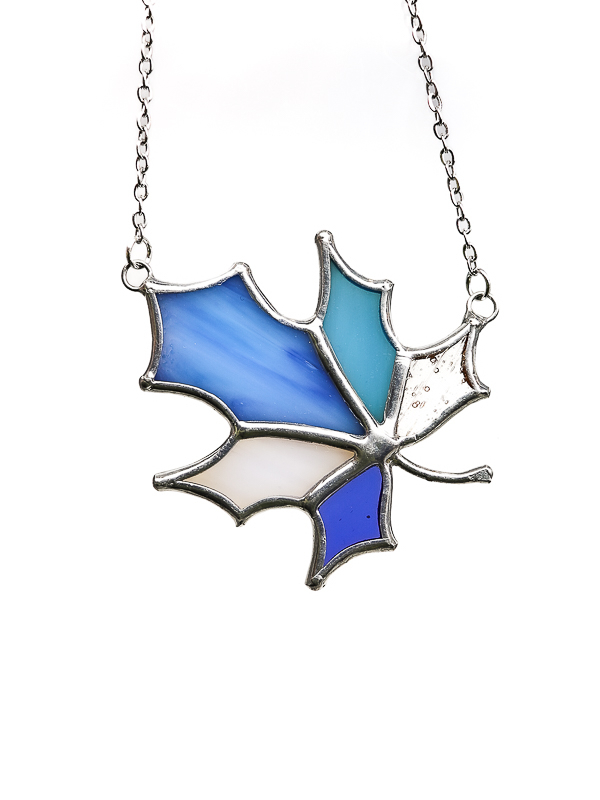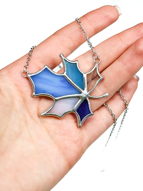 Стеклянная подвеска ручной работы в форме кленового листа, выполненная в технике Тиффани. Сочетание оттенков синего, голубого, молочного и прозрачного стекла создаёт ощущение глубины и света, напоминая игру неба и воздуха. Чёткие витражные линии подчёркивают природную форму листа и делают украшение выразительным, но лёгким по восприятию. Подвеска становится изящным акцентом образа и подойдёт как для повседневной носки, так и в качестве особенного подарка ценителям авторских украшений из стекла.