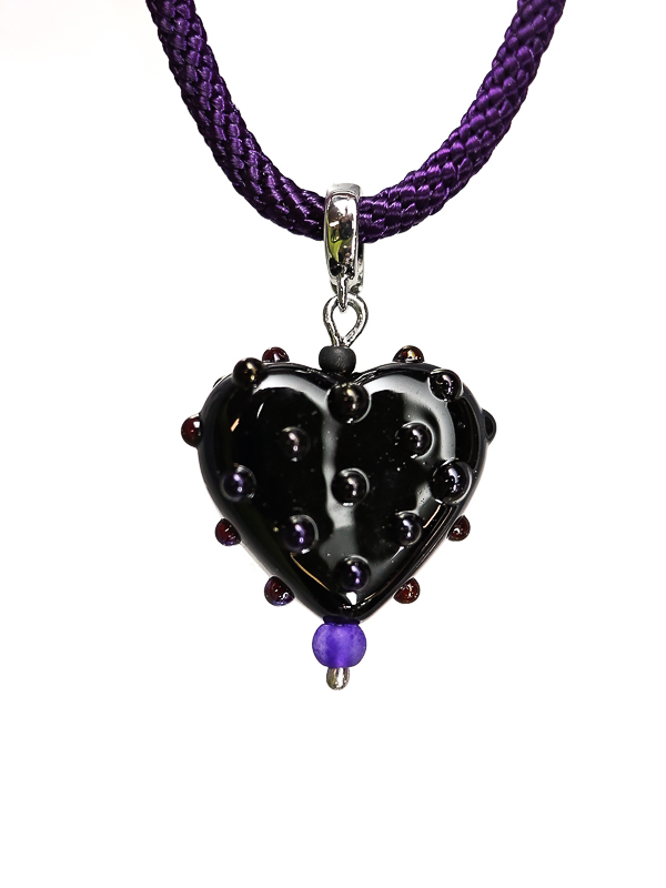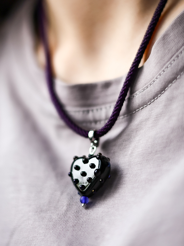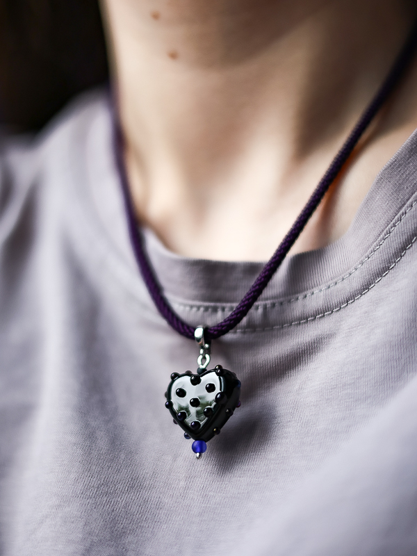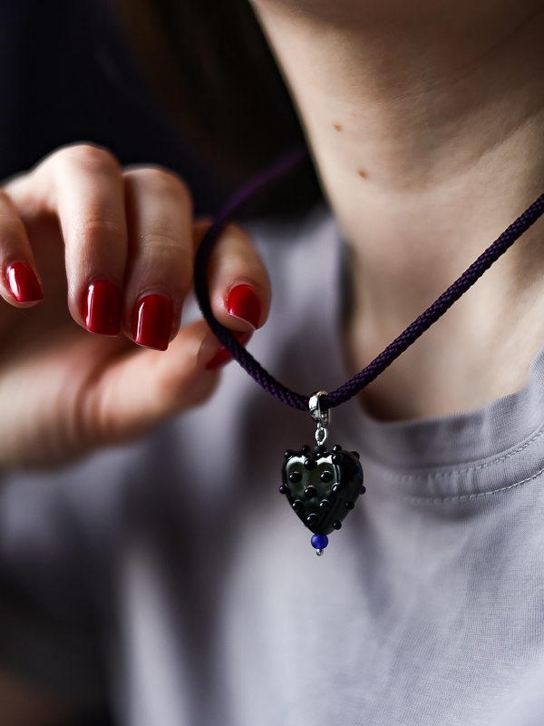 В цветовой гамме преобладают тёмные оттенки — чёрный, синий и фиолетовый. Эти насыщенные тона создают глубину и контраст, подчёркивая изящество и красоту подвески.