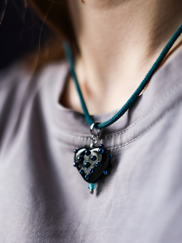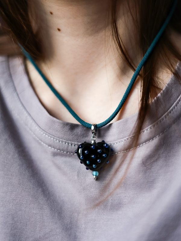 В цветовой гамме преобладают тёмные оттенки — чёрный, голубой и синий. Эти насыщенные тона создают глубину и контраст, подчёркивая изящество и красоту подвески.