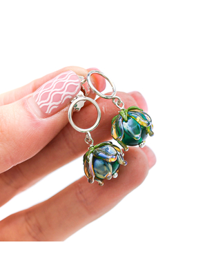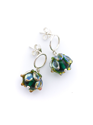 Серьги 'Изумрудная переливающаяся хризантема на маленьком колечке'