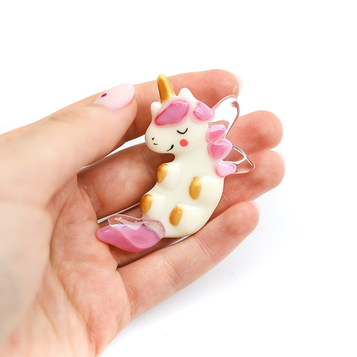 Техника исполнения: украшение сделано полностью из стекла в технике фьюзинг или спекание ( подобно мозаике, изделие собирается из отдельных фрагментов, предварительно вырезанных и обточенных из соответствующего цвета листового художественного стекла, затем сплавляется в печи на температуре 800°C).