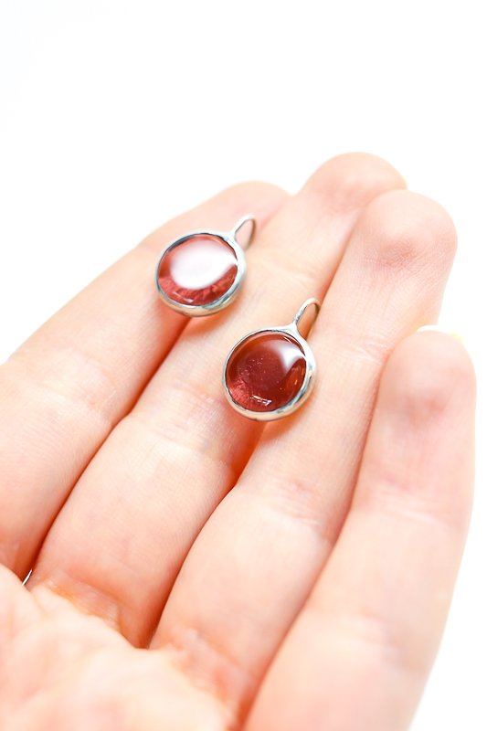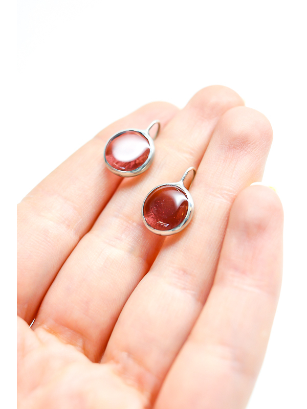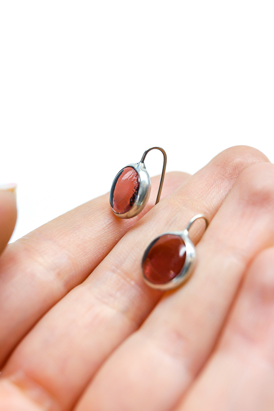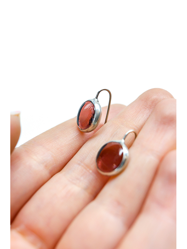 Серьги выполнены вручную в технике Тиффани: гладкие круглые элементы из прозрачного пепельно-розового стекла заключены в тонкую металлическую оправу с оловянной пайкой. Их поверхность мягко переливается при движении, отражая лучи света.