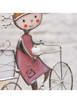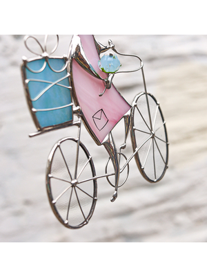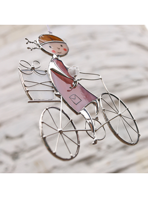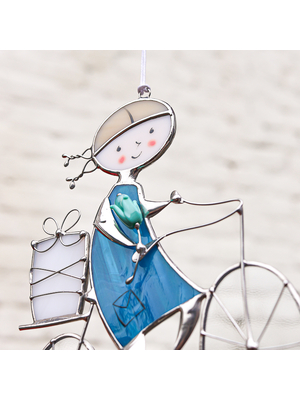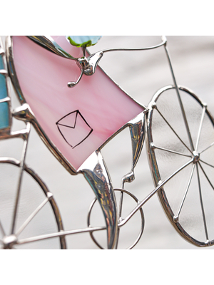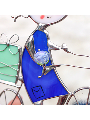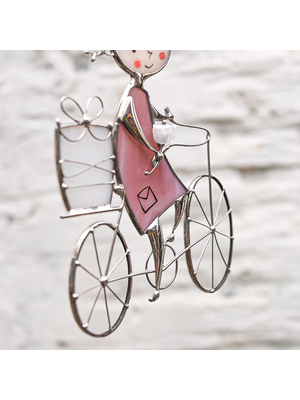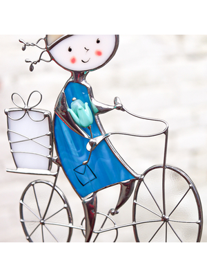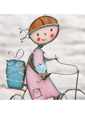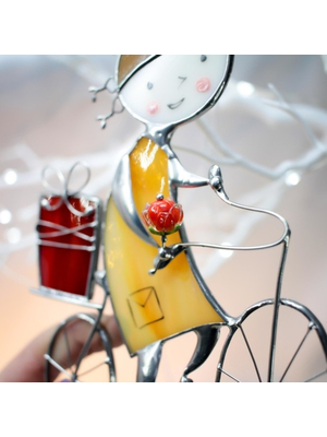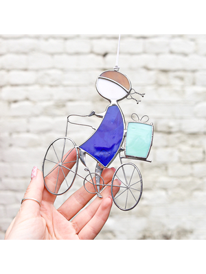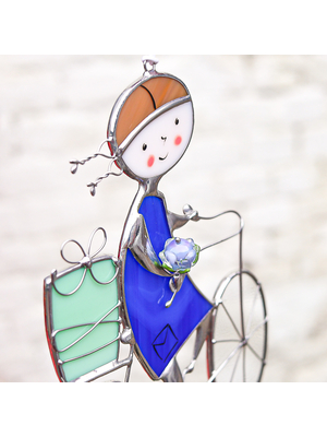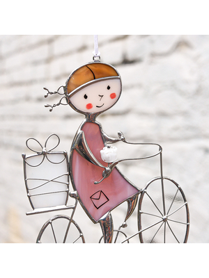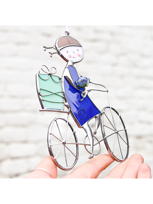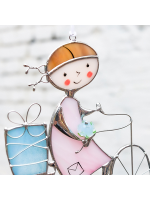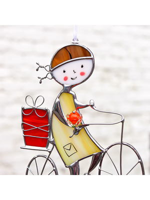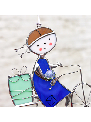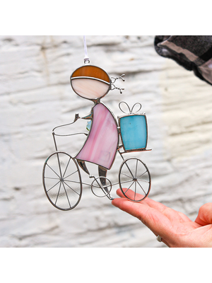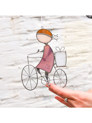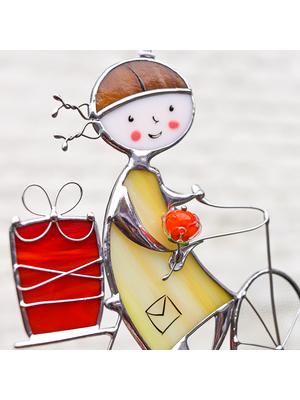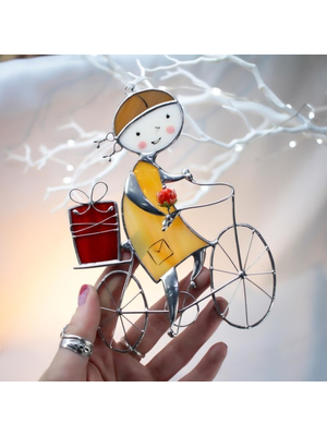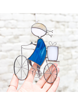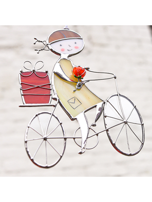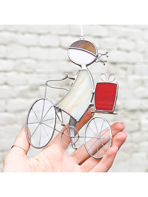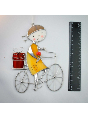 Витражная подвеска 'Велосипедистка с подарком' (11 х 15 см)