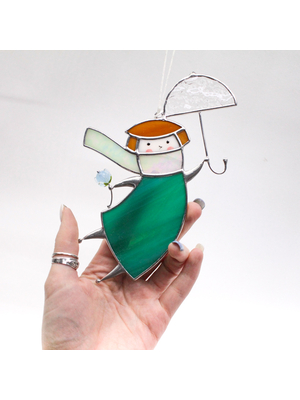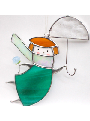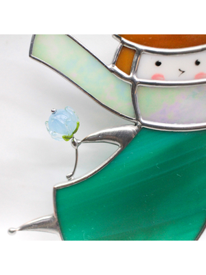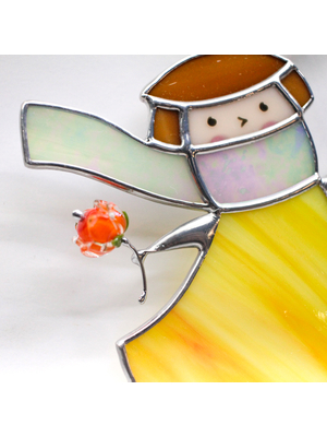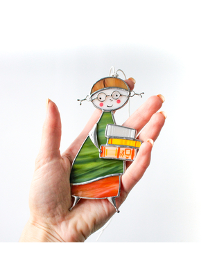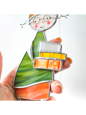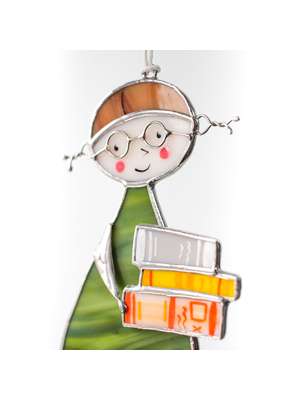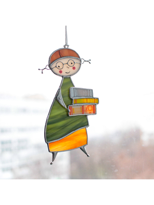Витражная подвеска 'Девочка с книжками в зелёно-оранжевом'